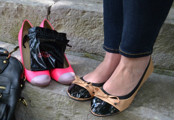 The flats come packaged in this portable (and adorable) drawstring bag that fits easily in your purse. The split-sole design allows the ballet flats to fold in half (pictured above). Fit in Clouds offers over fifteen styles to choose from, including a flip-flop option. I opted for the black/nude pair (pictured below) - they felt very Chanel to me and I knew they would go with nearly everything in my closet!